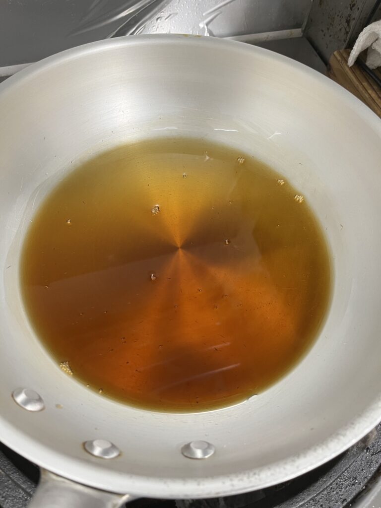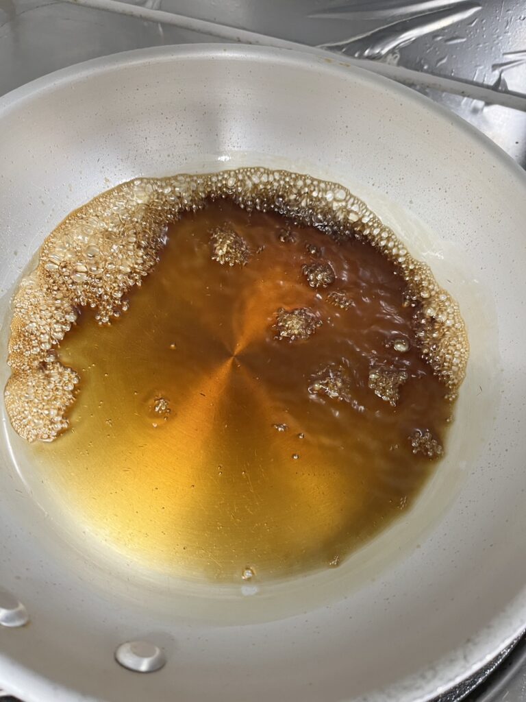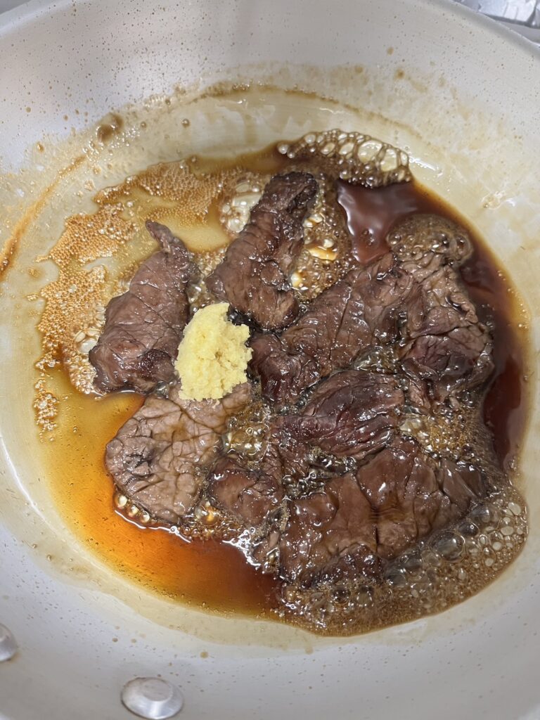 5.フライパンに合わせ調味料をいれて沸騰したところにモモ肉を入れる。