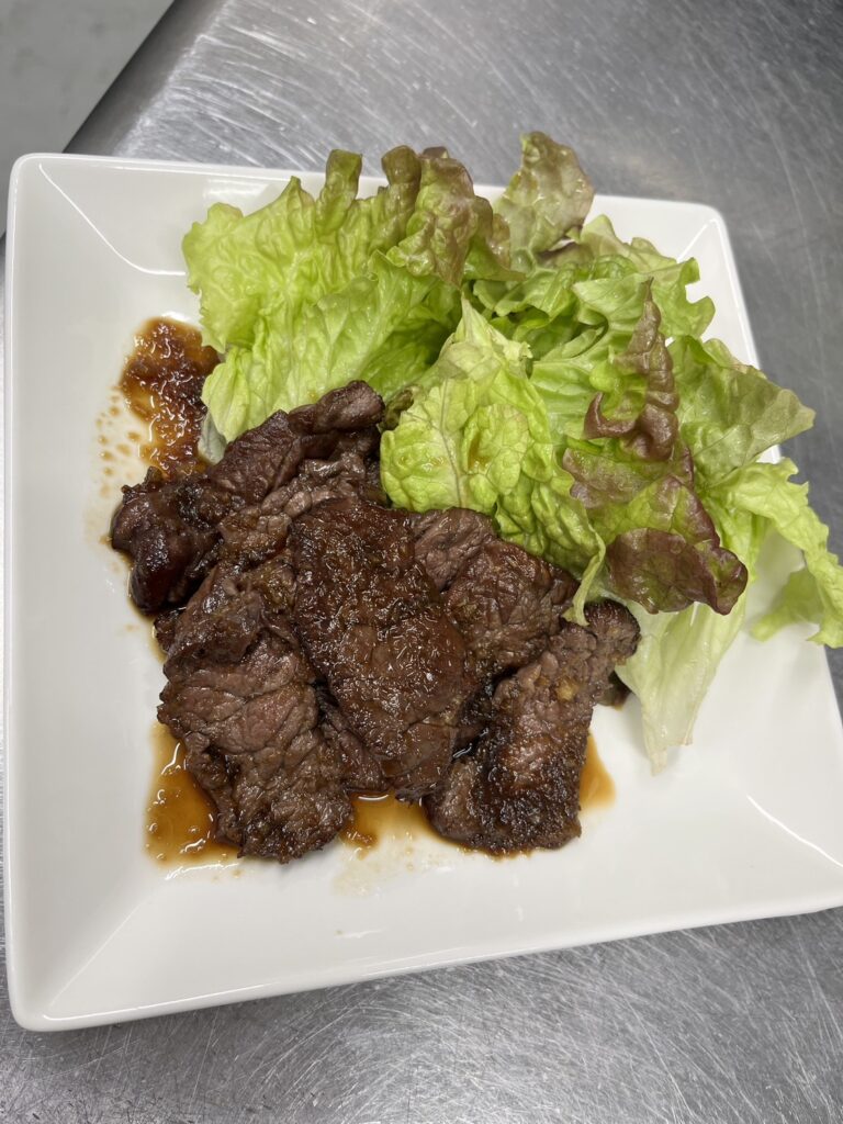 7.お皿にサラダを準備し、モモ肉を盛り付けたら完成。