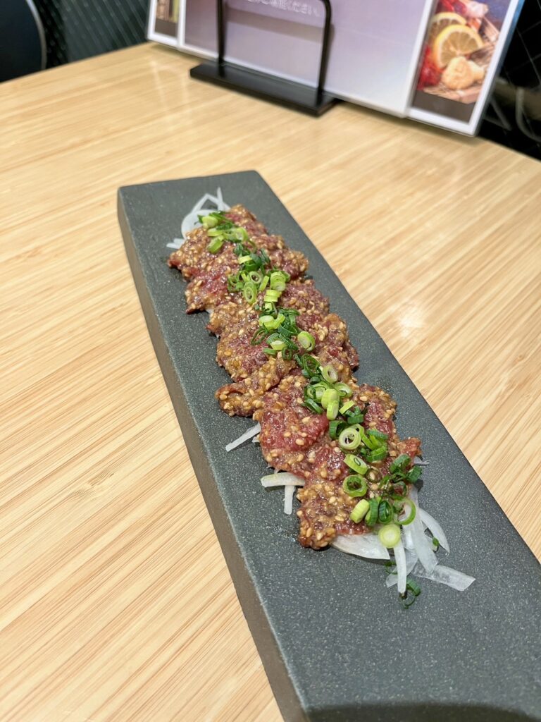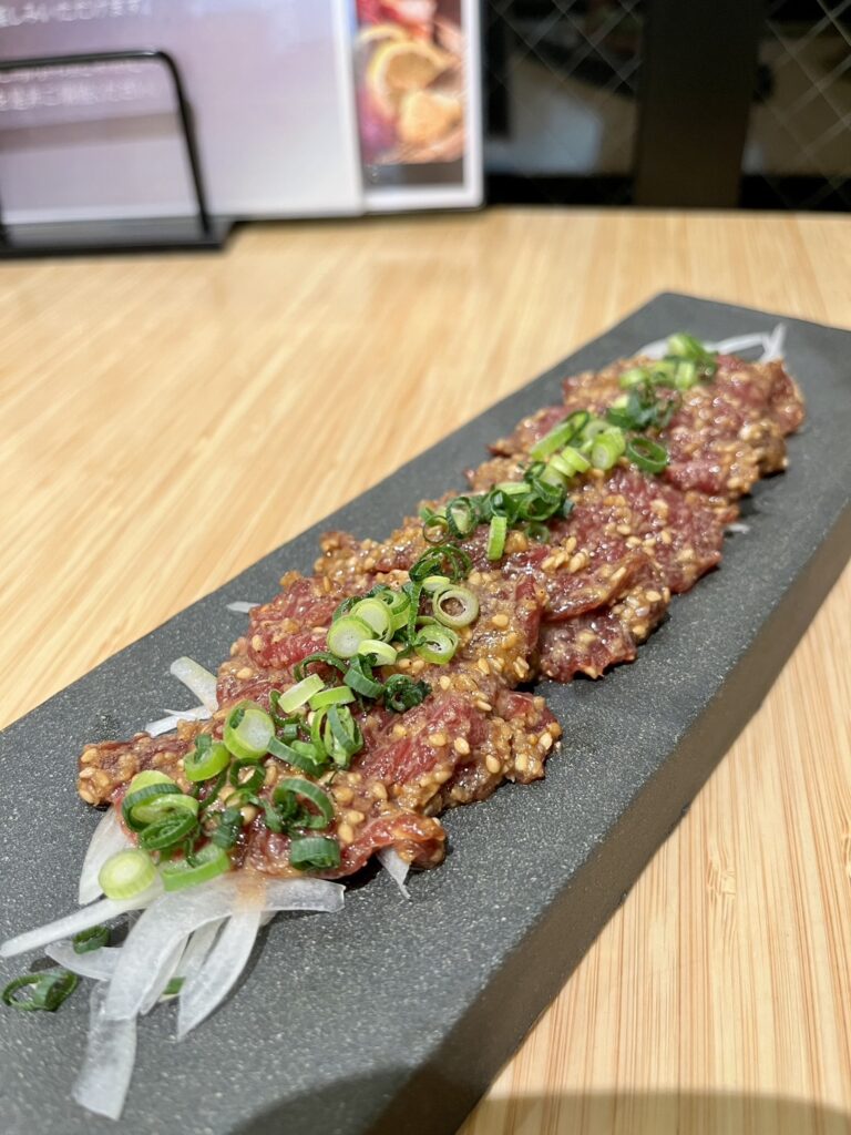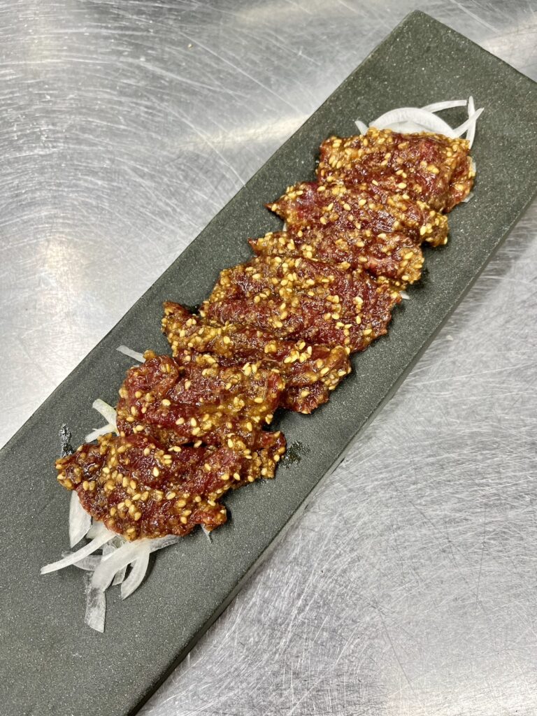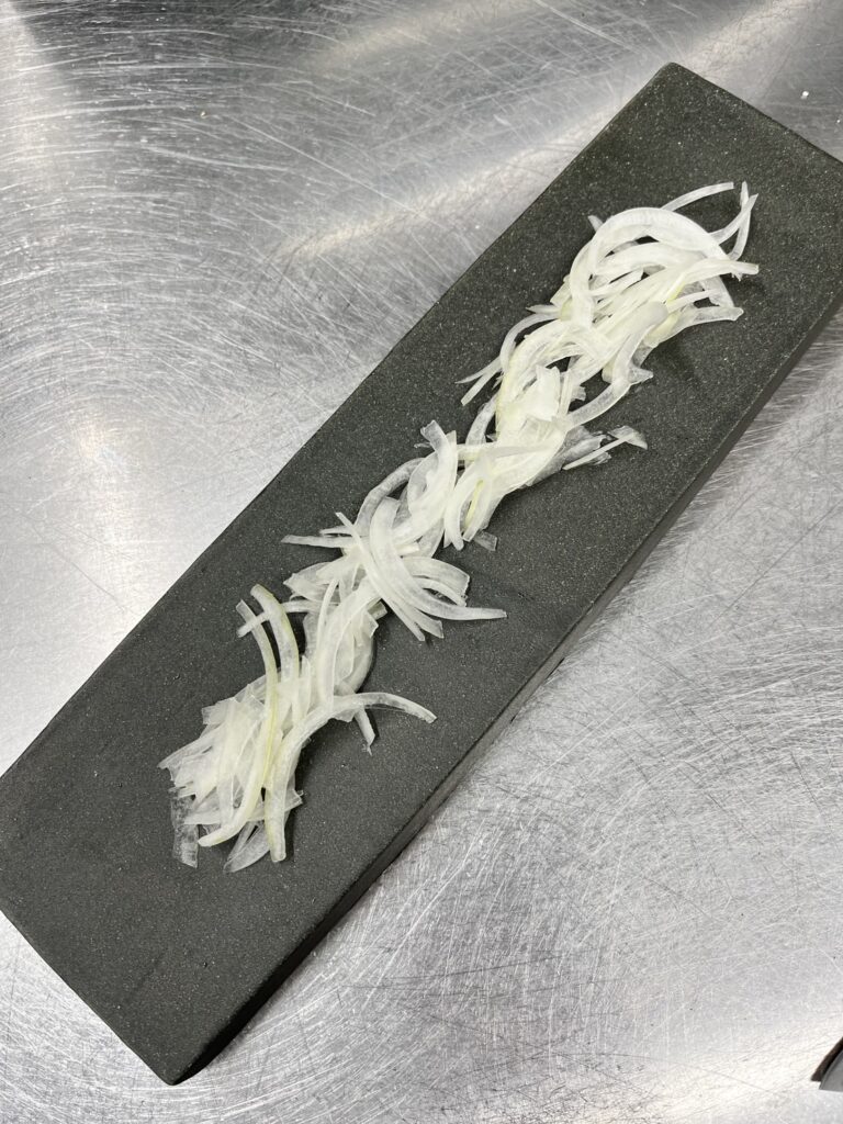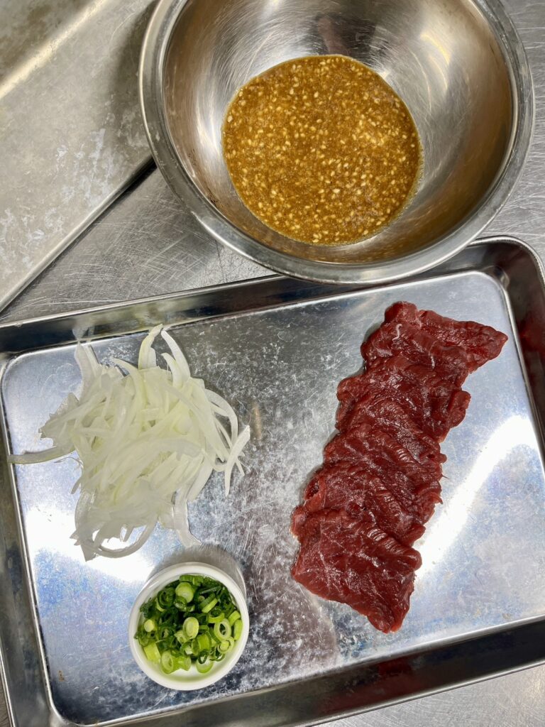 5.器に玉ねぎスライスを敷き、その上に胡麻だれと合わせた馬刺しを乗せます。