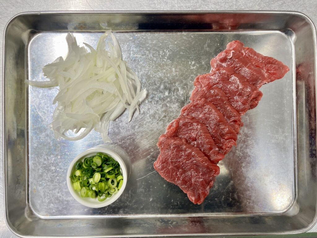 4.予め切っておいた、玉ねぎスライスと万能ねぎを準備します。