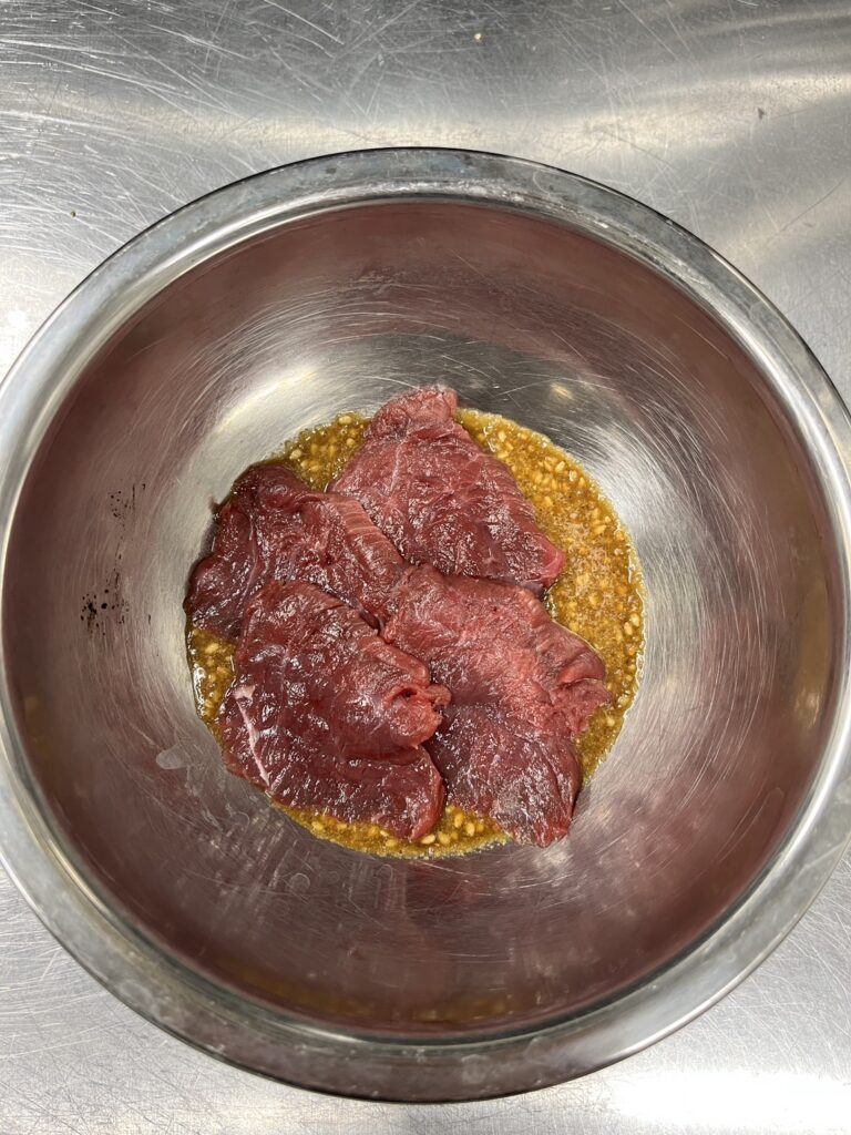 3.切っておいた馬肉を胡麻だれと混ぜ合わせます。