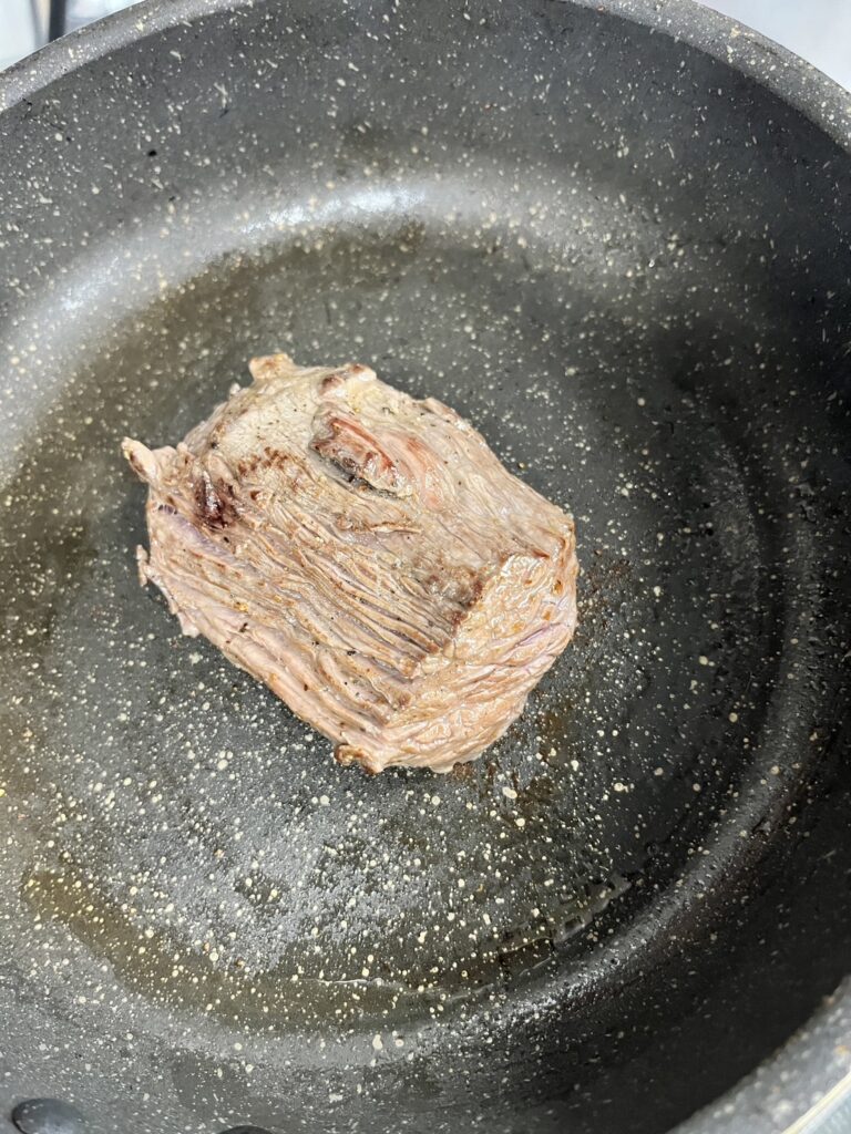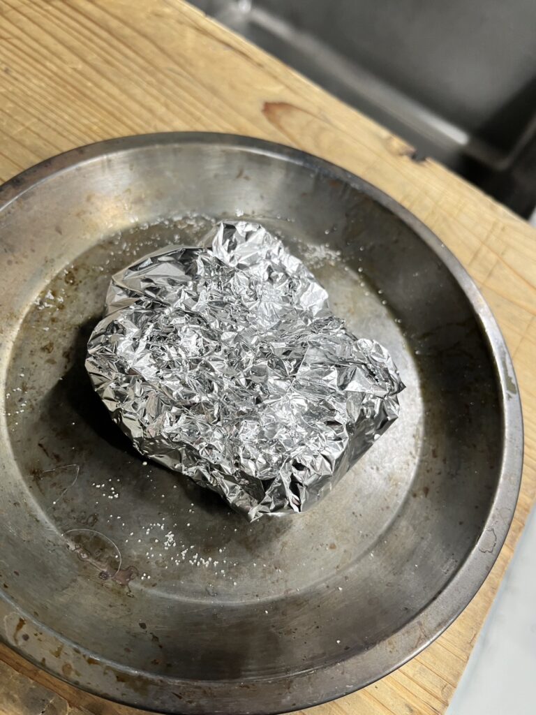 4.ロース肉を焼いていきます。強火で表面に焼き色をつけた後、フライパンから外します。その後、アルミホイルで包んで中まで温めます。※火を入れすぎると固くなります。