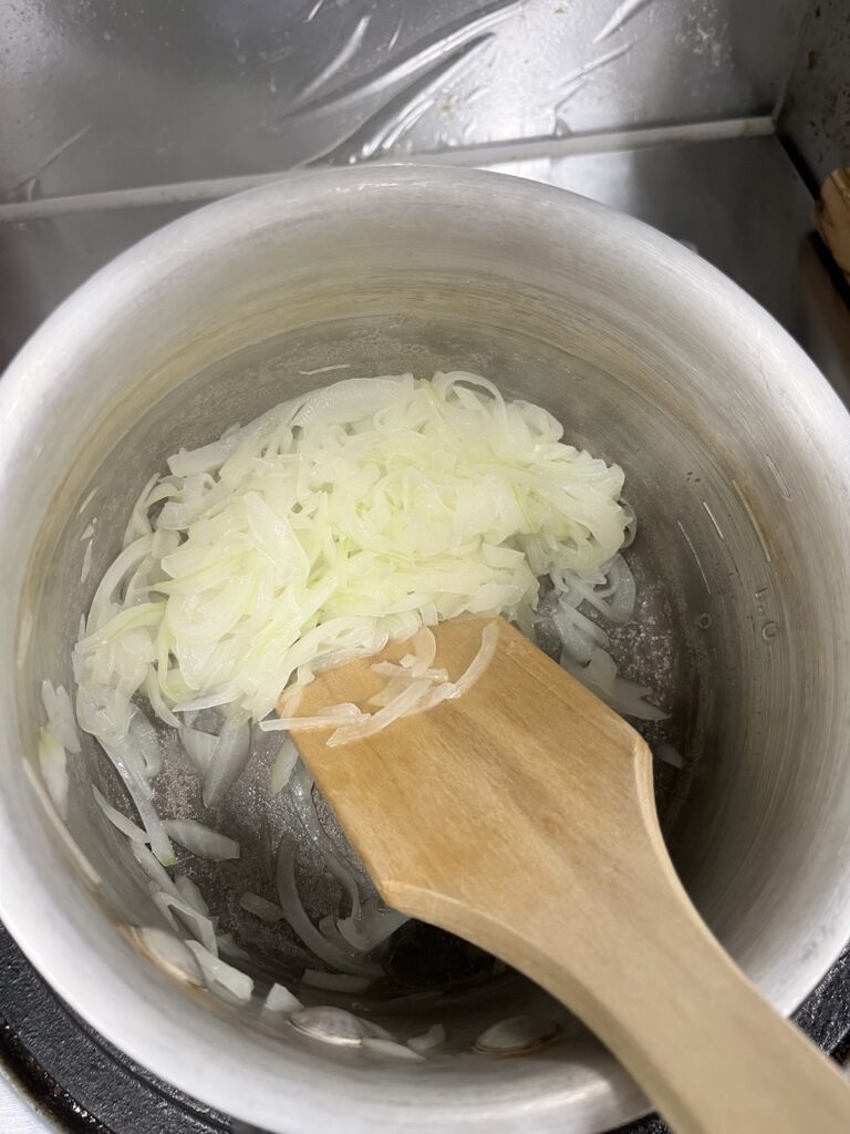 1. 鍋にオリーブオイルを入れ、オニオンスライスを炒めます。
