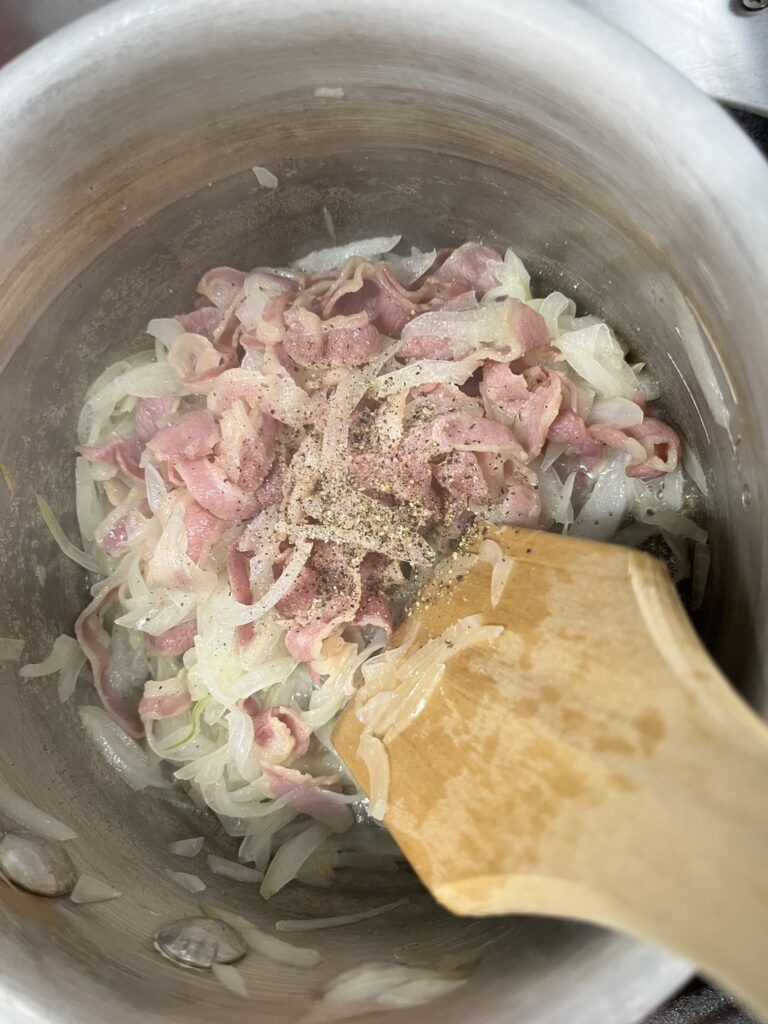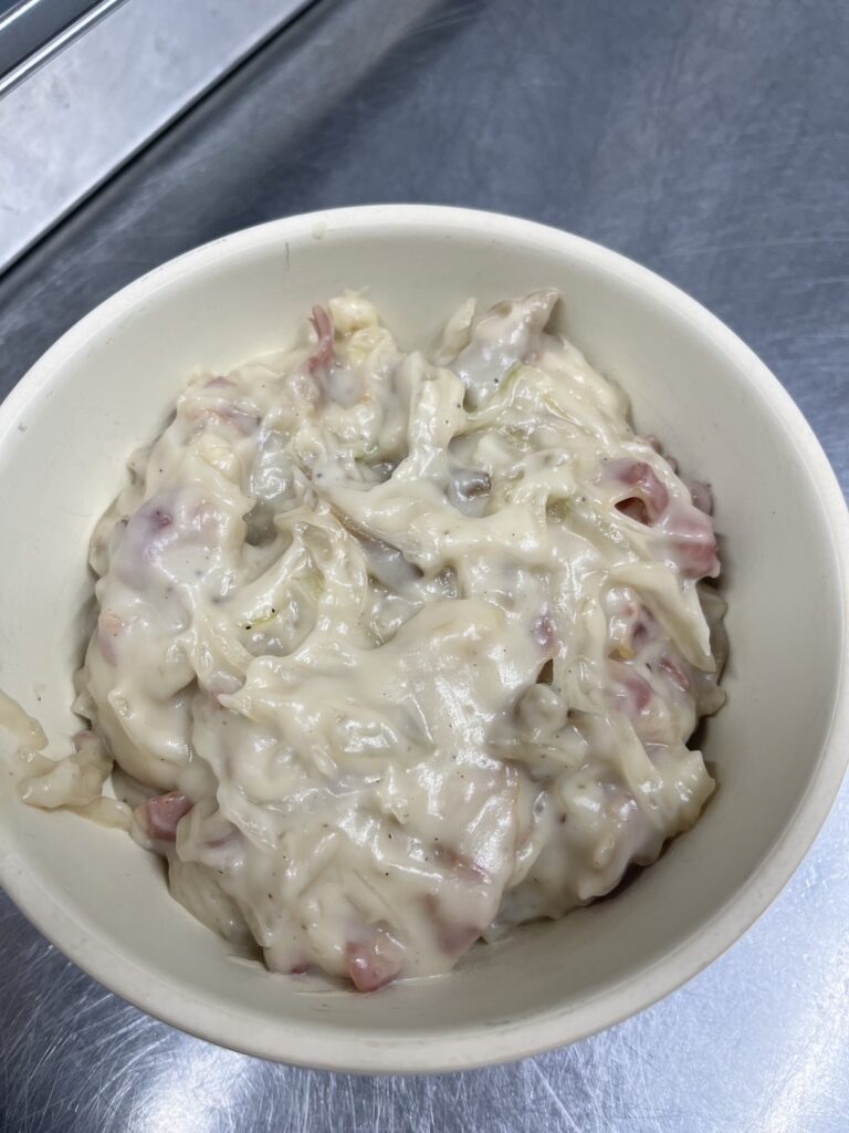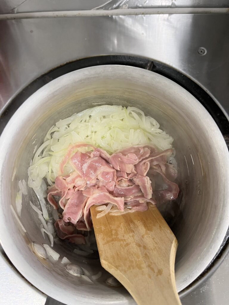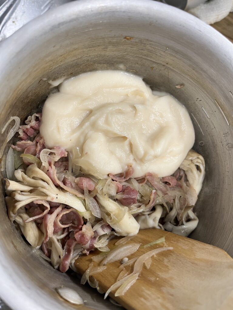 5. 舞茸、オニオンスライス、フタエゴ燻製を炒めた鍋にホワイトソースをいれ、混ぜ合わせる。味見をし、塩コショウをいれる。