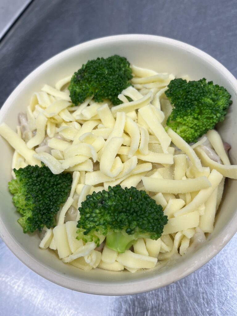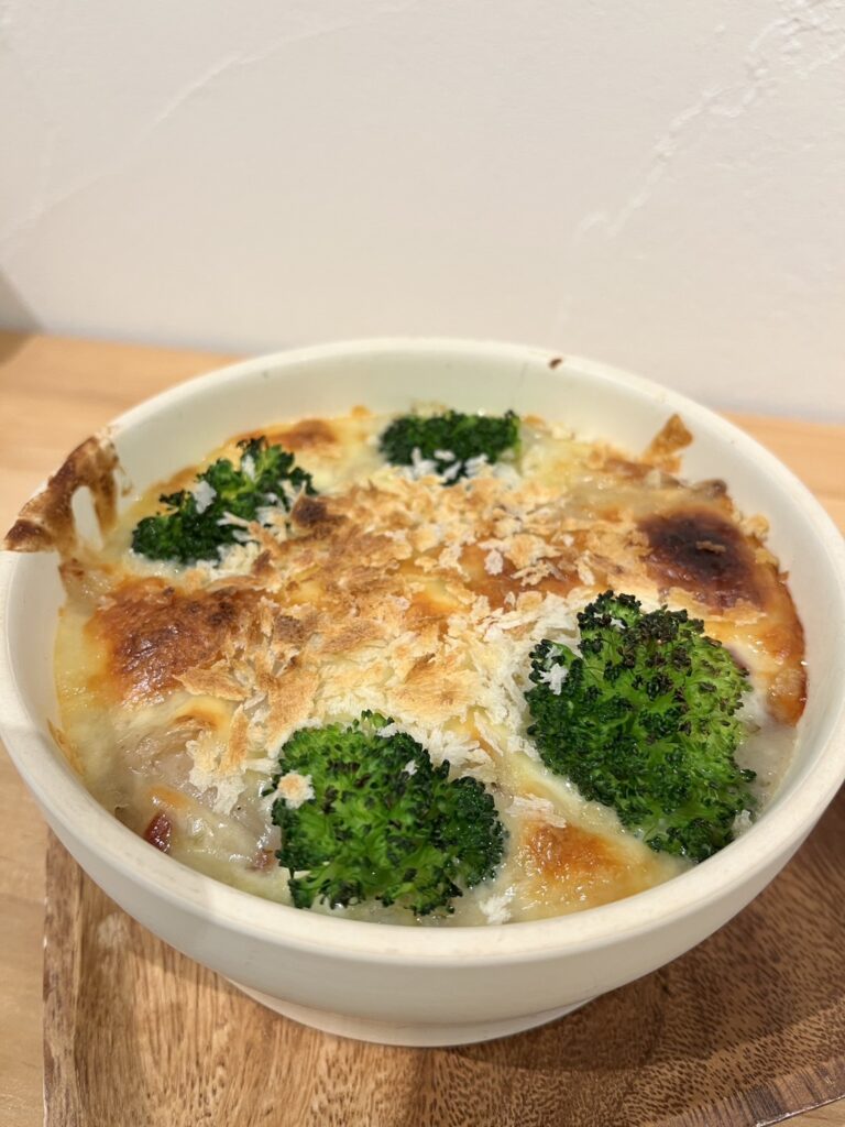 その工程によって、舞茸や野菜の香りをさらに感じ、味わい深くなります。ショートパスタ(ペンネ)を入れれば、ペンネグラタン。スパゲティを入れてもスパゲティグラタンに🐴