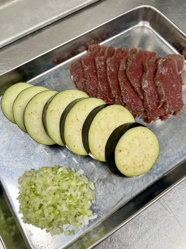 7.器に茄子を並べ、馬肉ロースを順番に並べます。
