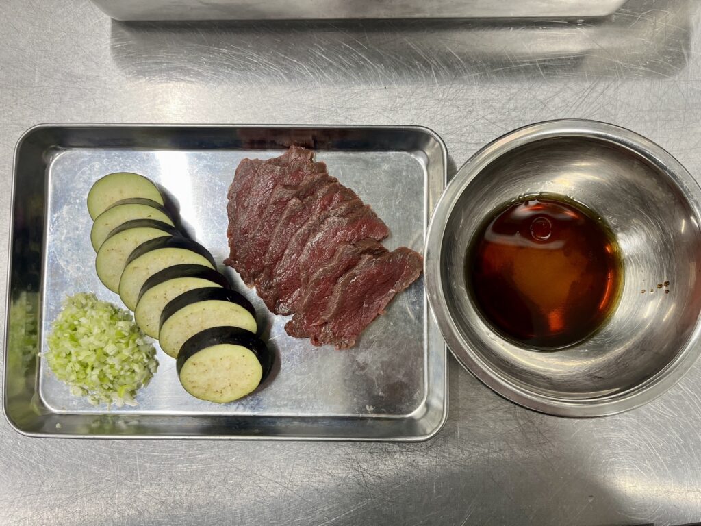 今回は【馬肉ロースと揚げナスの香味だれ】