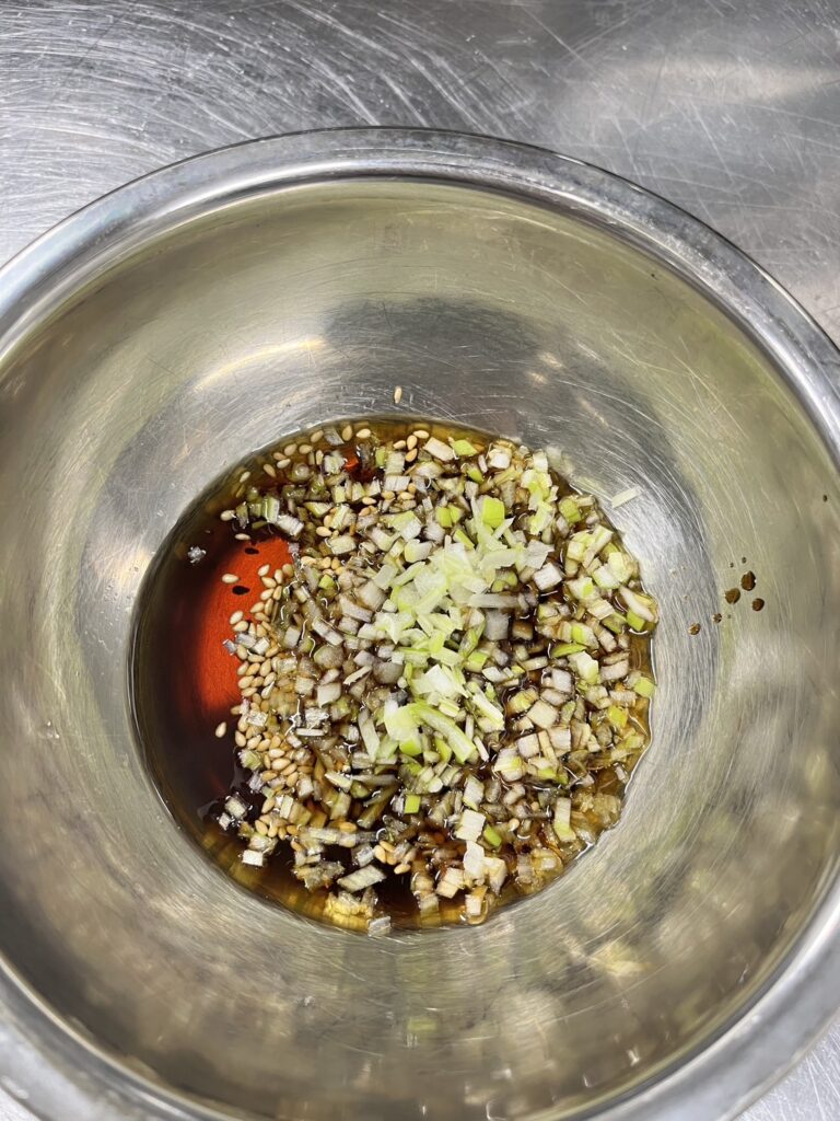 4.香味だれを合わせて、そこに長ネギのみじん切りも入れ、よく混ぜます。
