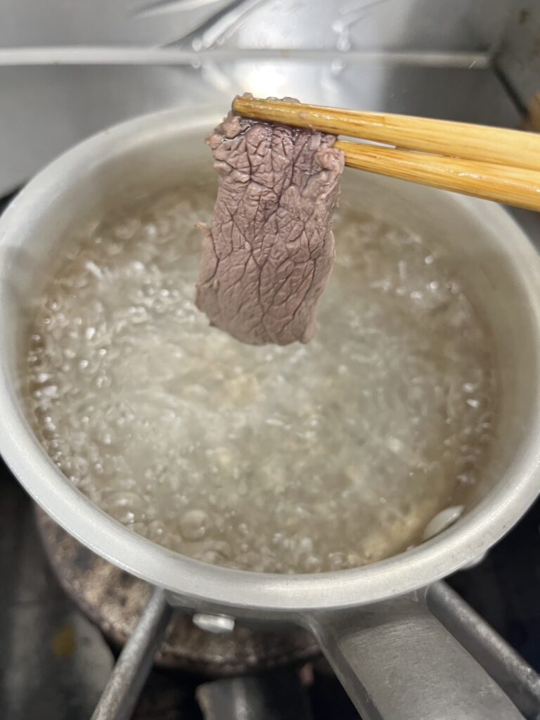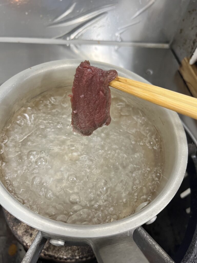 6.お湯を沸騰させ、馬肉ロースを切った数の半分量、湯通しします。