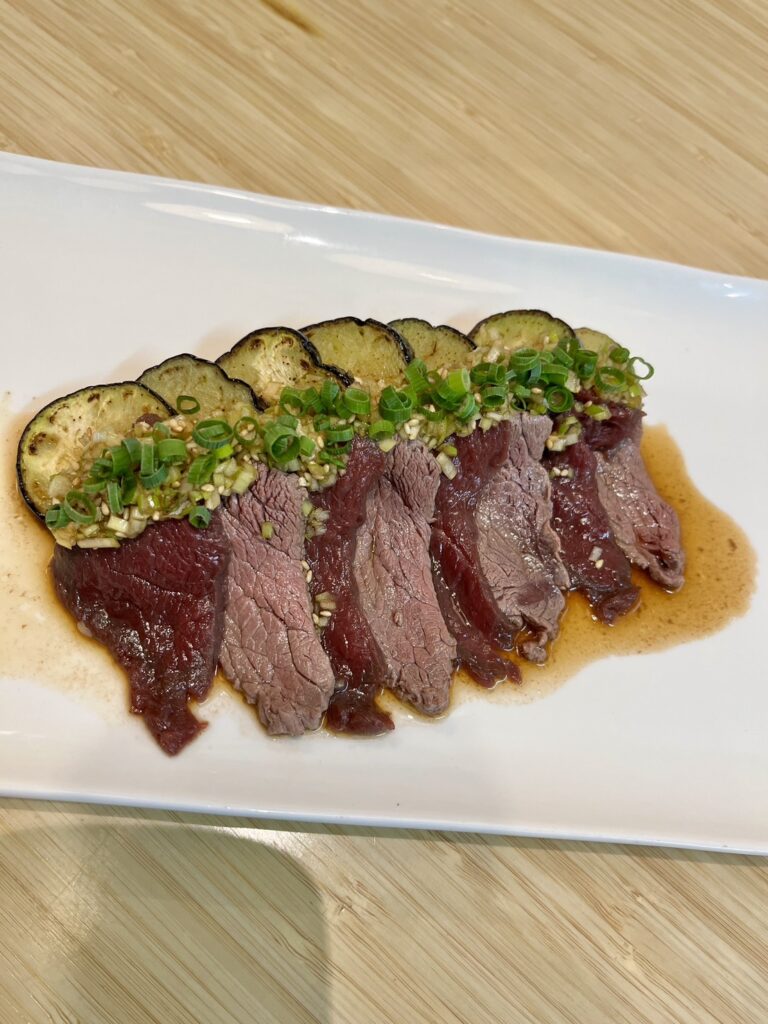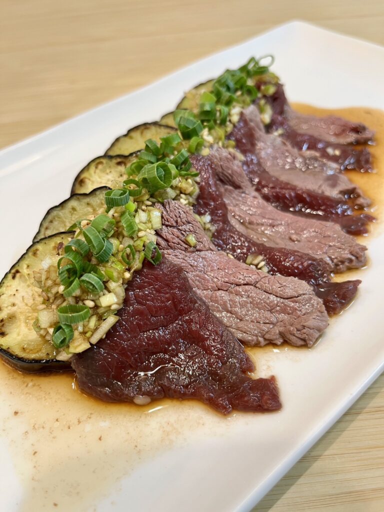 サッと湯通ししたロースと生のロースで風味や味わいが変わるのも食べてて楽しい部分です。茄子のトロッ感、馬刺しの柔らかさ、家でも簡単にできます!